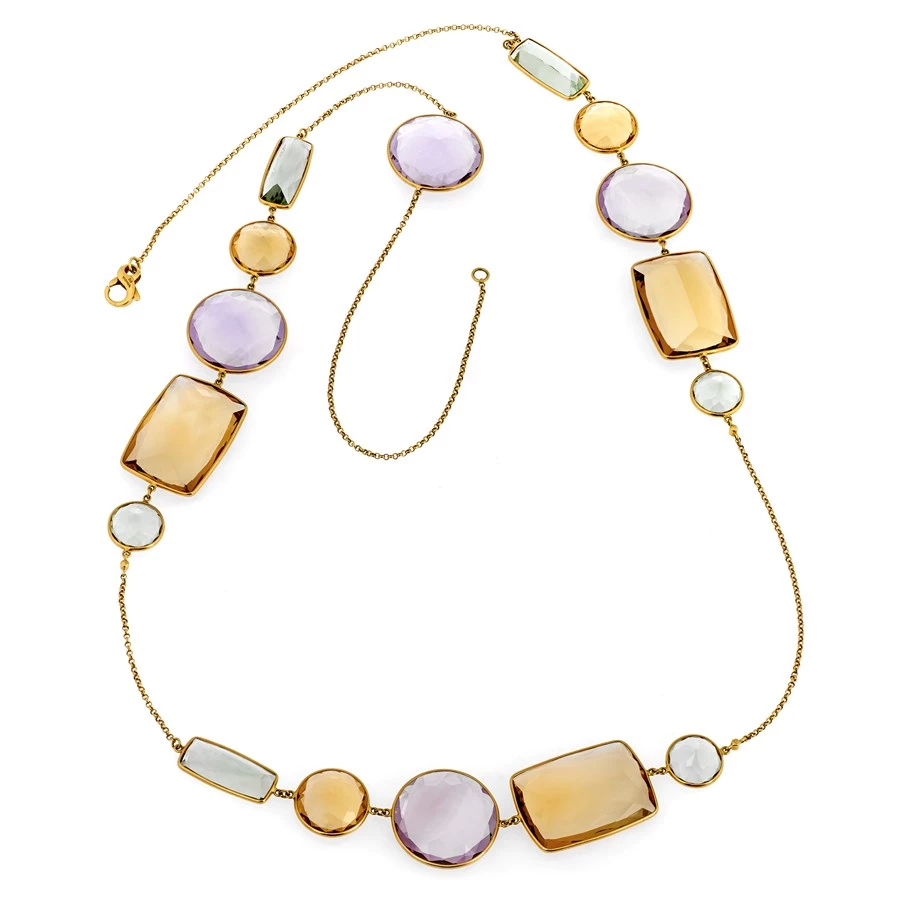 This warm, stunning and dazzling necklace consists of Citrine, Amethyst & Praziolite. With the necklace set in 18k yellow gold, the 3 different gemstone colors (pink & yellow) with round and rectangular shapes just add to the allure. Pairs beautifully with Medium Multicolor Citrine Necklace for a layered look. Handmade in Brazil.