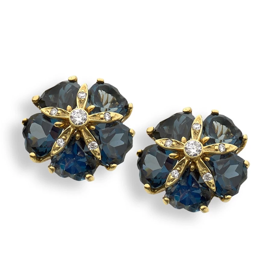 Elegant pair of sand dollar earrings boast ten heart-shaped London blue topaz gemstones (20 tcw) and pavé diamonds (0.40 tcw), handset into 18k yellow gold. Handmade in America.