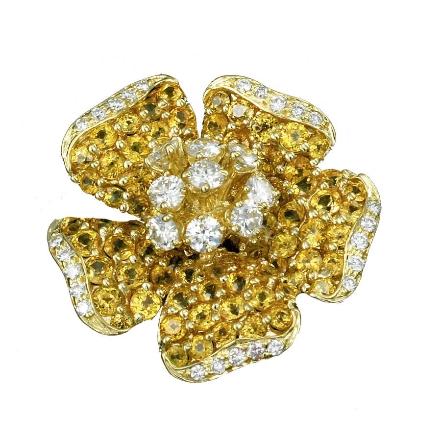 Bold, distinctive, even whimsical, handcrafted from 18k yellow gold. The magnolia is yellow sapphires (4.41 tcw) and diamonds (1.00 tcw). Handmade in New York.