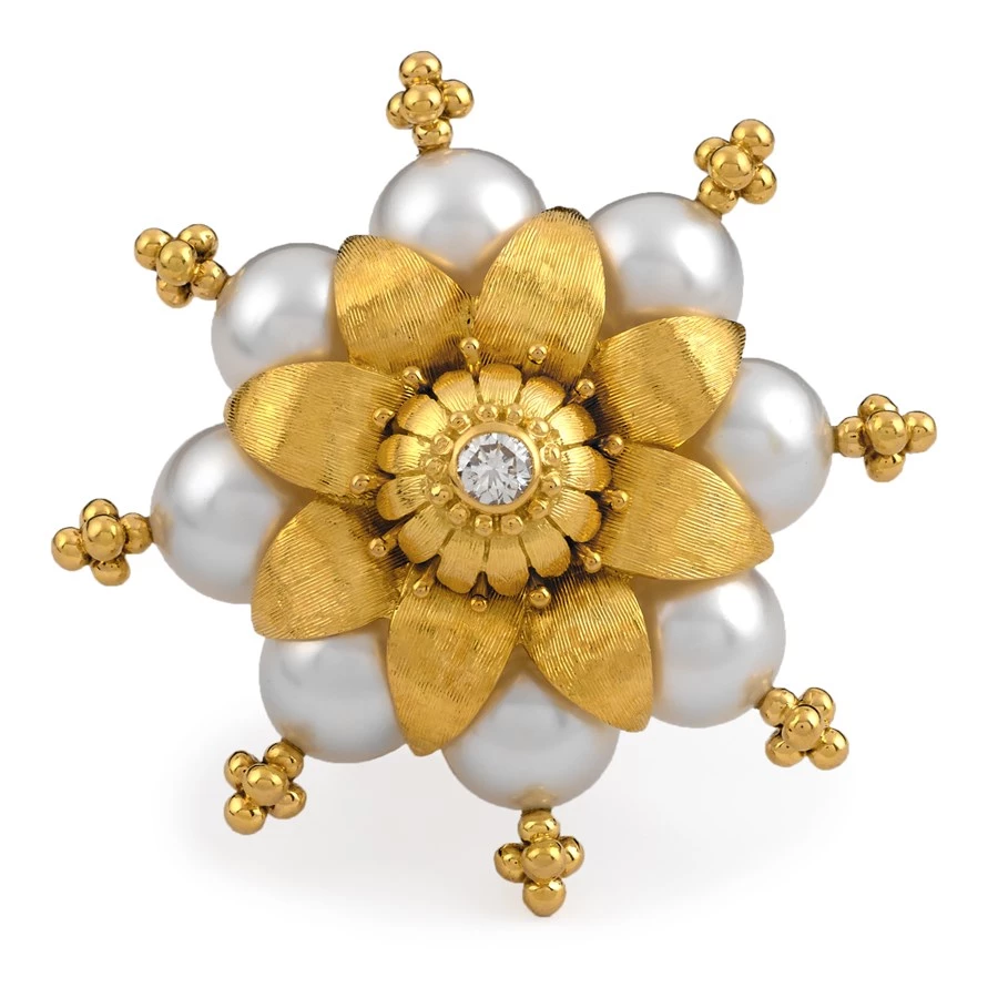 This stunning brooch combines bright, delicately worked 18k yellow gold and radiant pearls. 0.25ct diamond. Handmade in America.