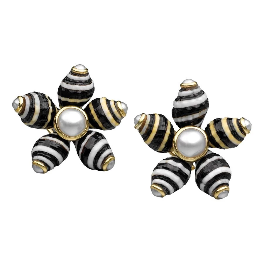 Stunningly unique and the perfect summer accessory or even for year round wear! Star-shaped earrings with black and white shells, 18K yellow gold, and cultured pearl centers. Handmade in America.