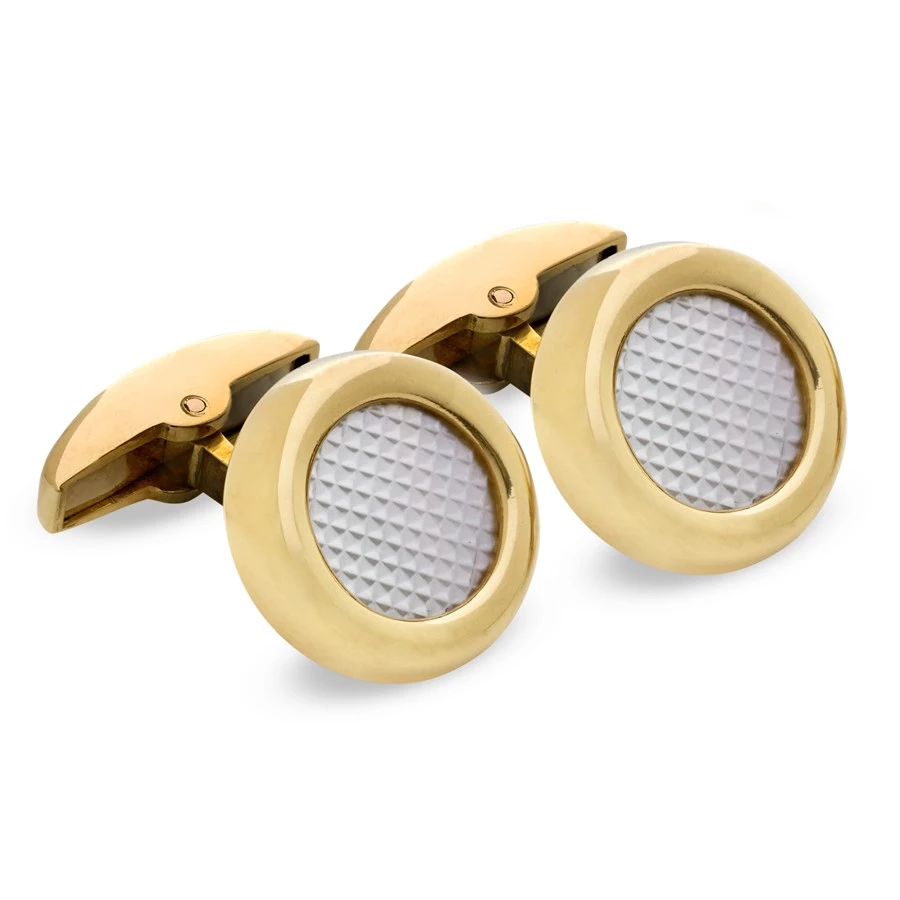 Truly timeless. Classic pieces with 18k yellow gold ridged centers. Small domed spring link fitting. Handmade in England.
