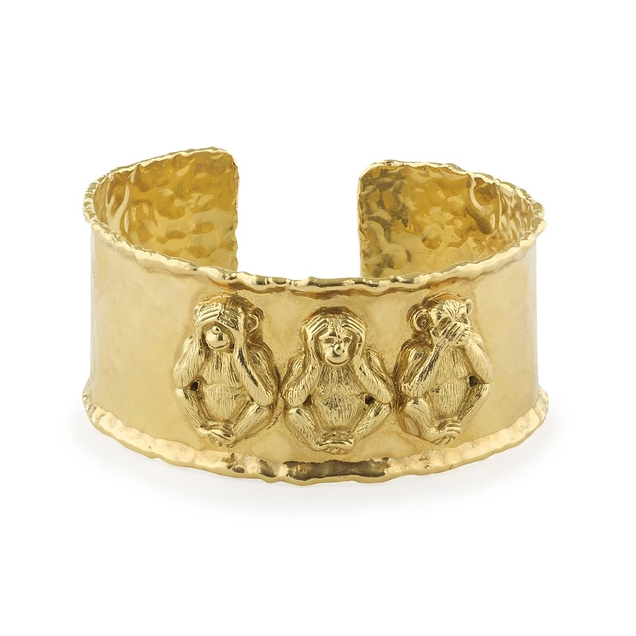 Whimsical 18k yellow gold cuff bracelet features the traditional wise monkey sculptures: See No Evil, Hear No Evil, and Speak No Evil. Skillfully handcrafted, molton gold is refined into elegantly textured fur and detailing on the monkeys, with a hammered finish on the cuff. Handmade in America.