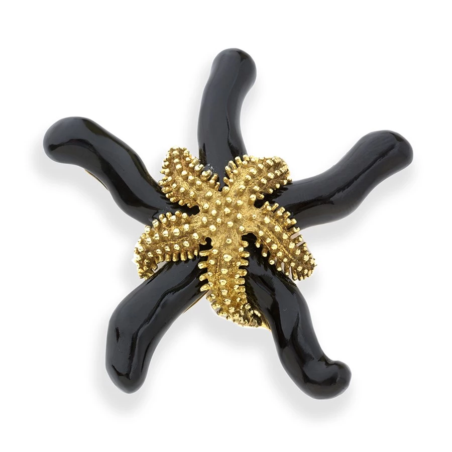 Entirely hand-assembled, this whimsical starfish pin features handcrafted 18K yellow gold center with a black 5-brach onyx. Handmade in America. Exclusively at Scully & Scully.