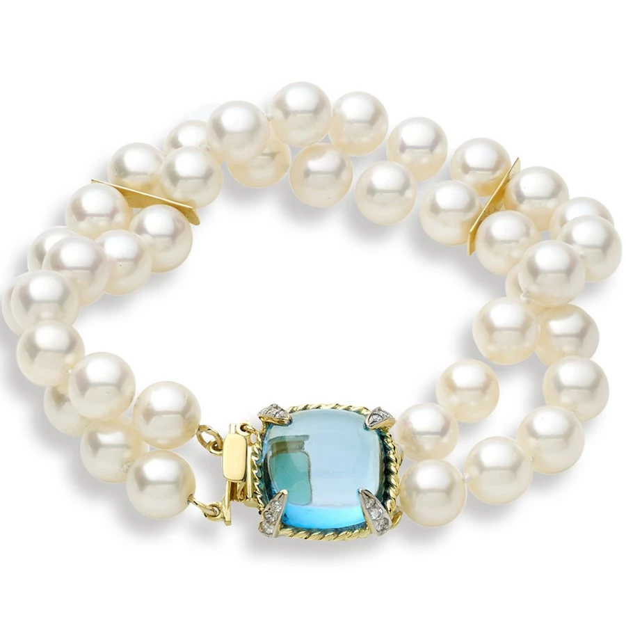 This unique bracelet features a stunning Swiss blue topaz accented by diamonds (0.24 tcw) prong-set by hand into 18k yellow gold. The cultured pearls across the two strands measure 7-8.55 mm each. Can be ordered with additional pearls for a longer bracelet: please call to enquire. Handmade in America. Exclusively at Scully & Scully.