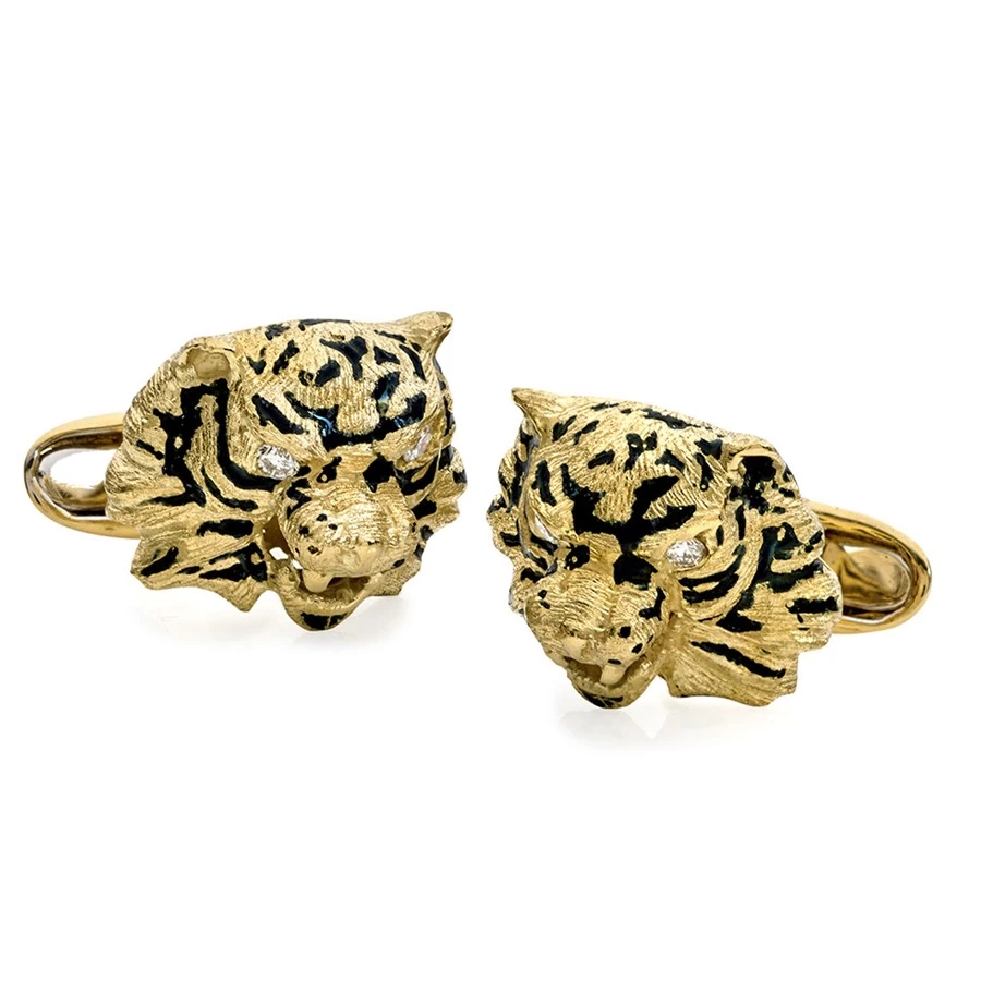 Beautifully handcrafted by artisans, 18K Yellow Gold Tiger Face with Diamond Eyes Cufflinks are made by hand in Italy. The sparkling eyes are diamonds, while the face is handmade from gold with rippling hand applied black enamel. The perfect finish to any gentleman’s outfit.