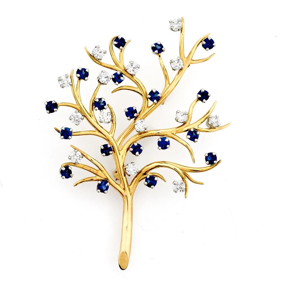 The exquisiteness of nature in 18k yellow gold with precious stones. Pin has 19 round sapphires (2.25 cts.), 14 round brilliant-cut diamonds (1.4 tcw) and platinum leaf stems. Handmade in America.