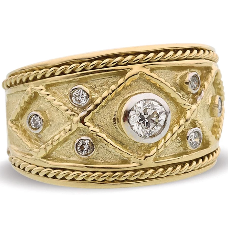 18k yellow gold tapered cigar band with twisted gold rope design set with round white diamonds (.42 tcw). Handmade in America.