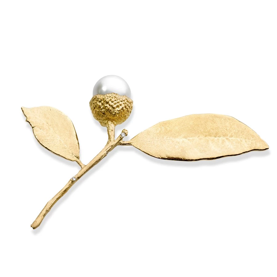 Southern Oak Acorn Brooch with 19.2 karat leaves, stem and cap. Three diamonds totaling 0.05cts. and one 13.5mm South Sea Pearl. Handmade in America.