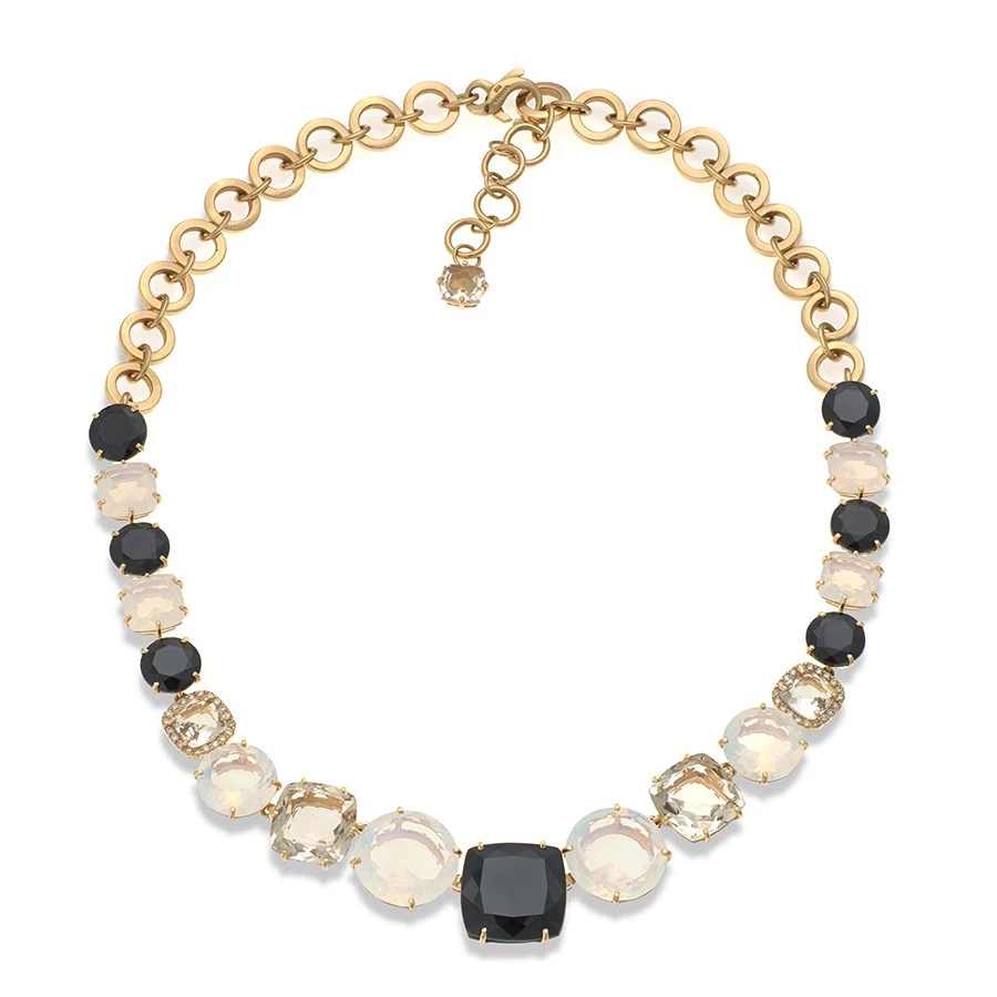 A stunning necklace carefully crafted of 74.2 carats of black quartz, morion quartz, and citrine. Stone width is graduated from ⅝” to ⅞”. Enhanced with dazzling diamonds (.32 tcw). Handmade in Brazil.