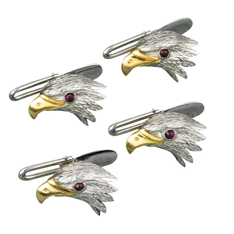 Stunning eagle cufflinks and studs are made of 18 karat yellow and white gold with ruby eyes. Cufflinks feature t-bar closures. Handmade in England. Exclusively at Scully & Scully.