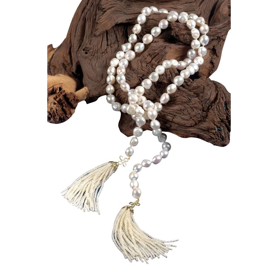 Bring out the flapper in you! This fabulously long strand of cultured freshwater pearls can be worn as is, looped as a shorter necklace, and even worn as a belt. The two tassels suspended from beautiful 18k yellow gold are formed of cultured seed pearls. Approximately â…œ” diameter. Handmade in America.