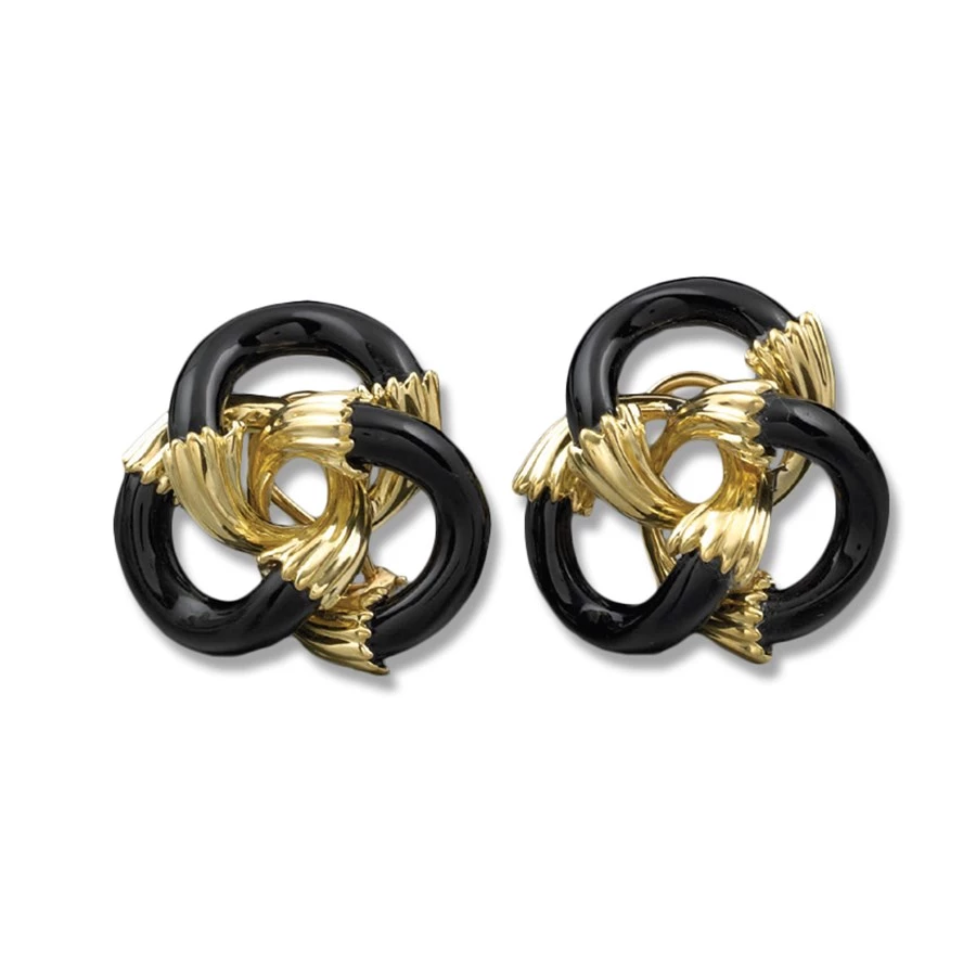 Carved black onyx is highly polished and organically combined with handcrafted 18k yellow gold spiral fluted motif. Handmade in America.