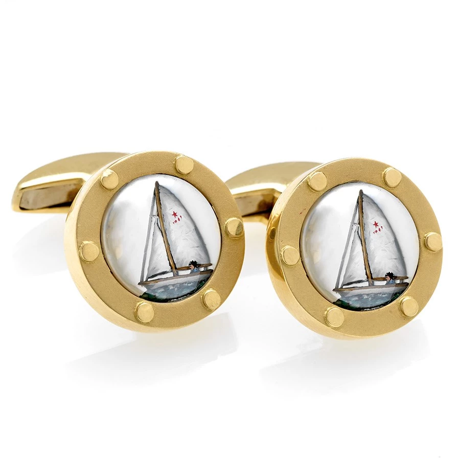 Made from the finest 18k yellow gold, these crystal cufflinks have been intricately hand-painted with yachts surrounded by gold porthole detailing. Miniature pieces of art made to be worn on a sleeve with pride. Each cufflink is finished with a spring link fitting. Handmade in England.