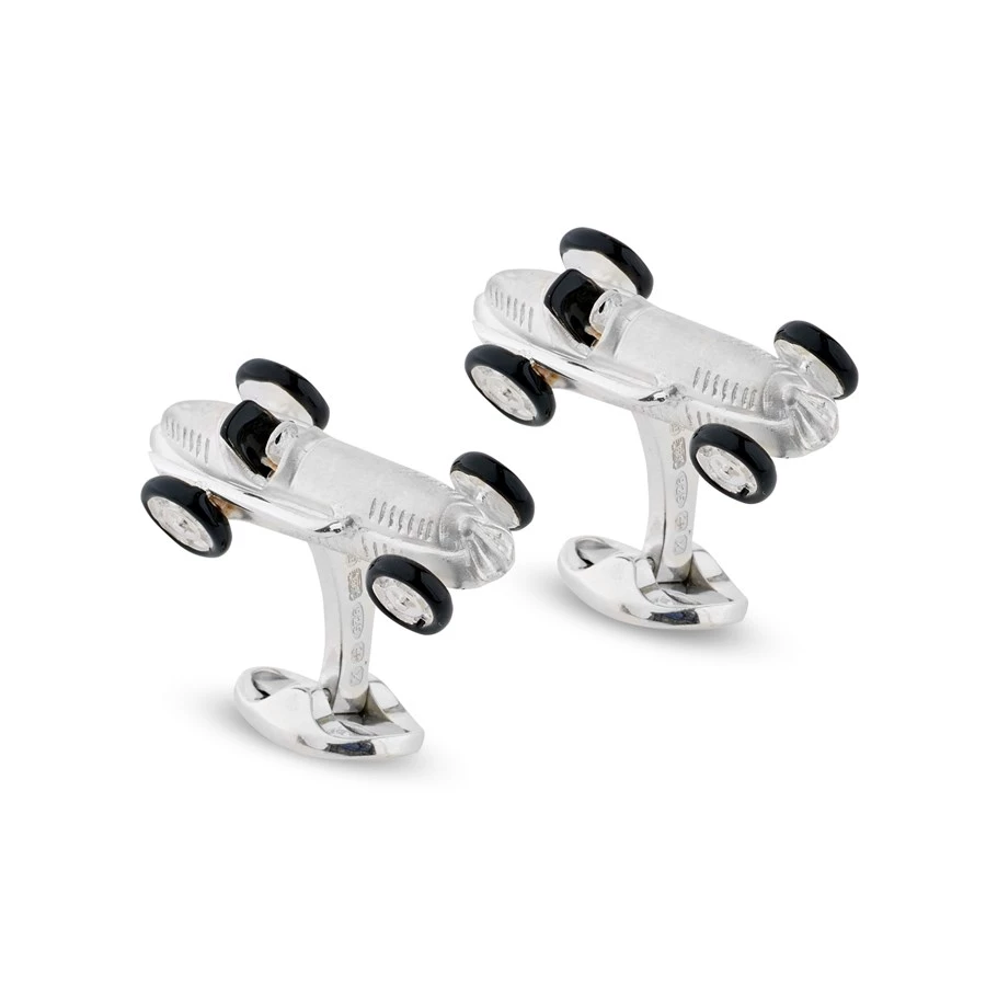 Honor the legacy of autmobile racing with these stunning silver and enamel cufflinks featuring a vintage racing car. Handmade in England, these cufflinks are guaranteed to be a fine addition to any suit.
