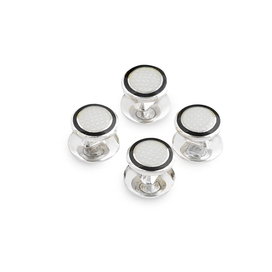 A timeless black enamel and clear crystal set of four studs to complete a gentleman’s outfit. Handcrafted of hallmarked sterling silver, each stud features a clear checkered crystal center with a glossy black hand-enameled banded rim. Handmade in England.