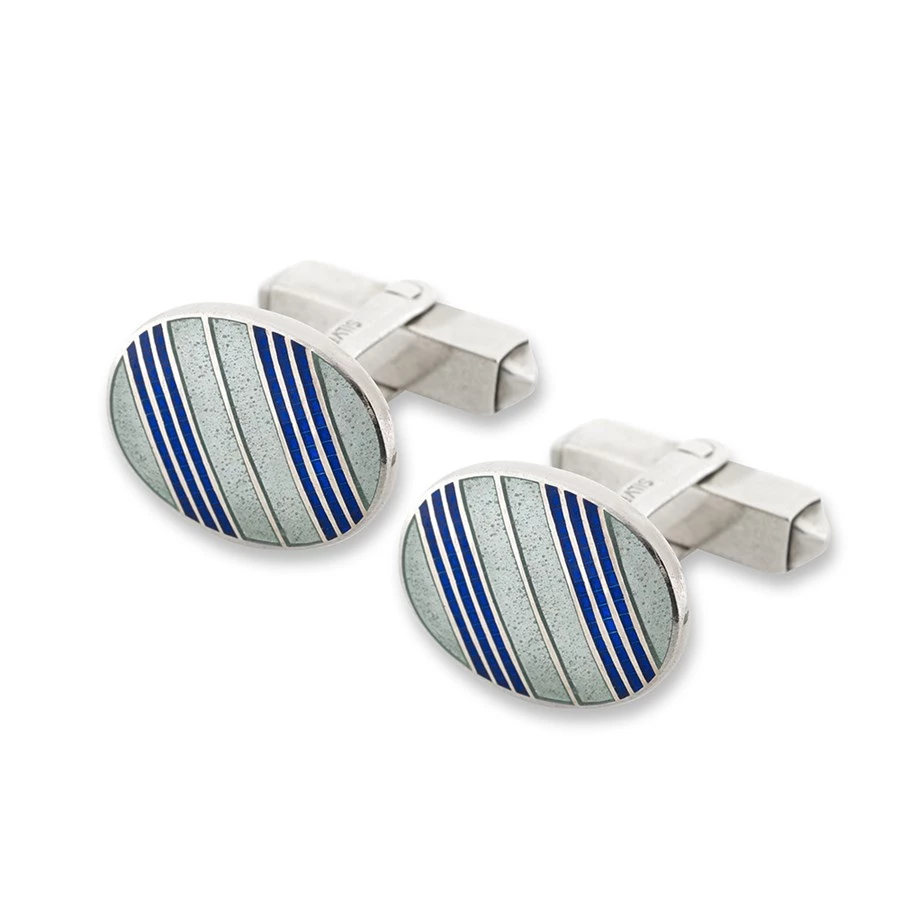 Handcrafted of sterling silver, each cufflink features a spring back t-bar and is hand-enameled with handsome blue and white enamel stripes. Family owned and handmade in England since 1685.