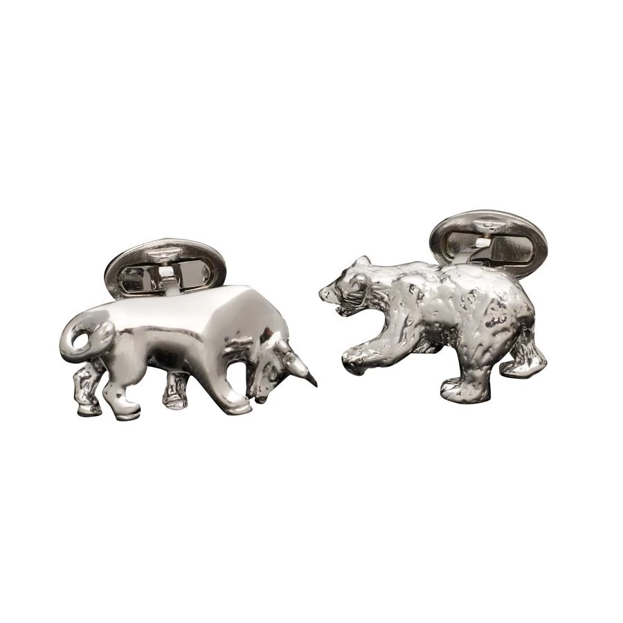 Handcrafted of 925 sterling silver, this executive pair of cufflinks represents the two modes of the markets: bear and bull. Rhodium plating provides an anti-tarnish finish. Designed in New York City.Â