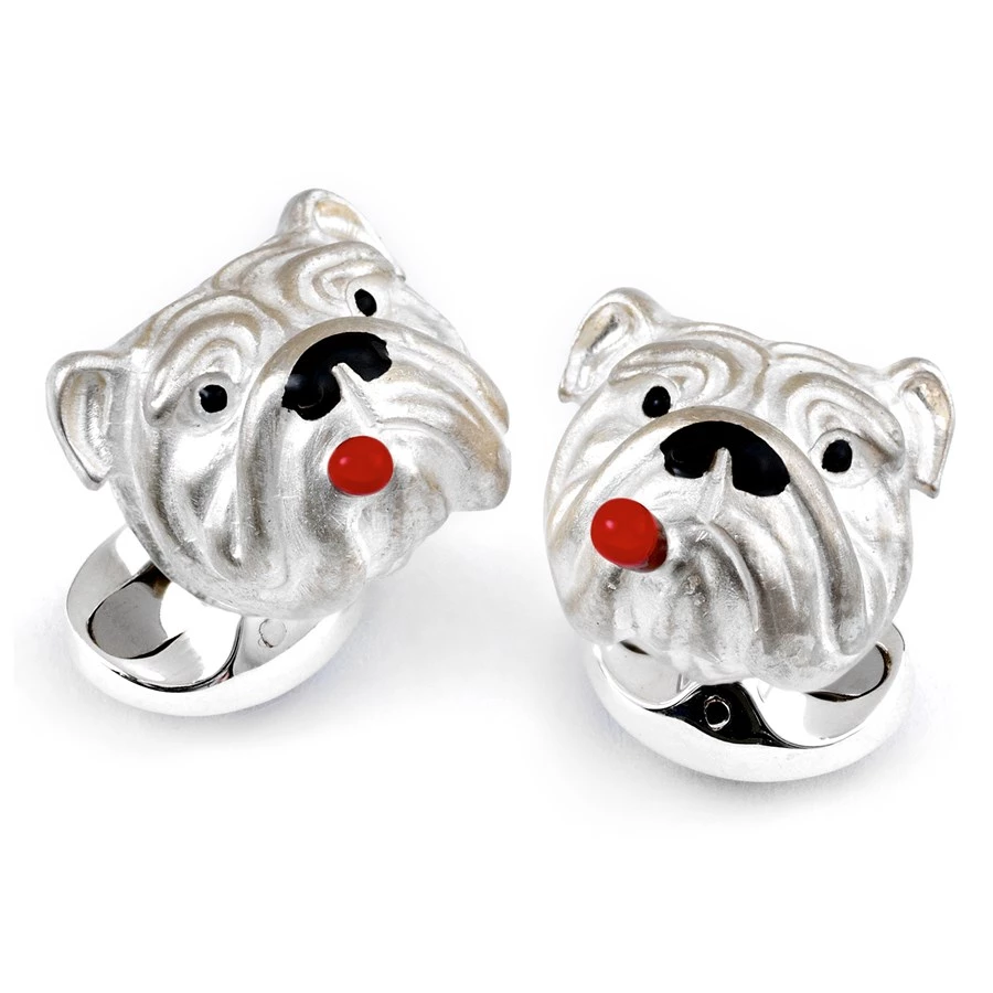 Handmade in England. The bulldogs’ cigars are enameled. Inspired by Sir Winston Churchill, these British Bulldog cufflinks are truly patriotic. Referred to by many as ‘the greatest Briton’, Sir Winston Churchill was rarely photographed without a cigar.