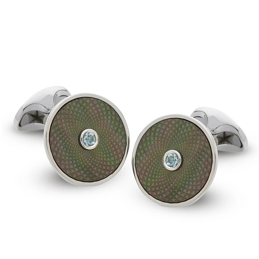 Inspired by the dreamcatcher, each hallmarked sterling silver cufflink sports a shimmering precision-cut piece of mother of pearl capped by a precious gem center. The mother of pearl is cut with an intricate pattern matching the lines of a dreamcatcher. Because mother of pearl is a natural product, each will be slightly unique in appearance. Handmade in England.