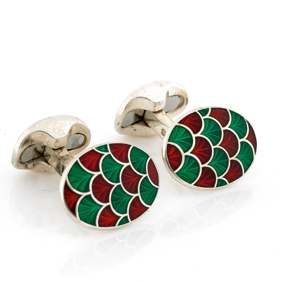 If you are looking for a classic pair of oval cufflinks with a splash of color, these sterling silver accessories are perfect. Hand-enameled in a variety of color combinations, the scalloped fishscale enamel will brighten up any outfit. Features a small domed oval spring link fitting. Hallmarked sterling silver, handmade and hand-enameled in England.Â
