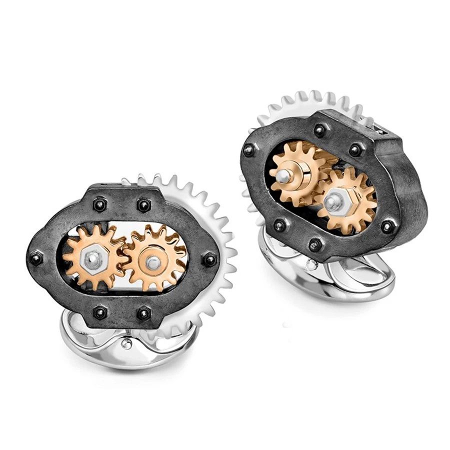 Unique cufflinks are specially designed with moving gears for an industrial look. Rose gold-plated details set against sterling silver add an elegant finish with a black oxidized frame on domed oval spring link fittings. Handmade in England.