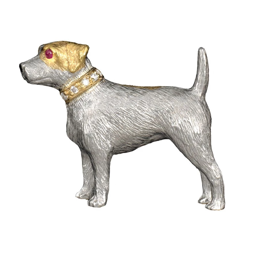 Handcrafted of sterling silver with ruby eyes, this Jack Russell proudly stands to attention with his 18k yellow gold collar with diamond accents (.06 tcw). Handmade in England. Exclusively at Scully & Scully.