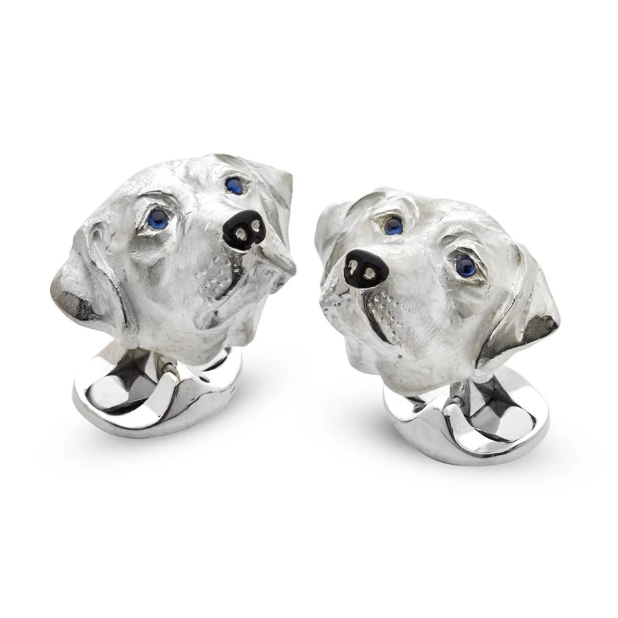 An affectionate and loyal companion. Button nose and eyes consisting of deep blue cabochon sapphire gems. Small domed spring link fitting. Handmade in England.