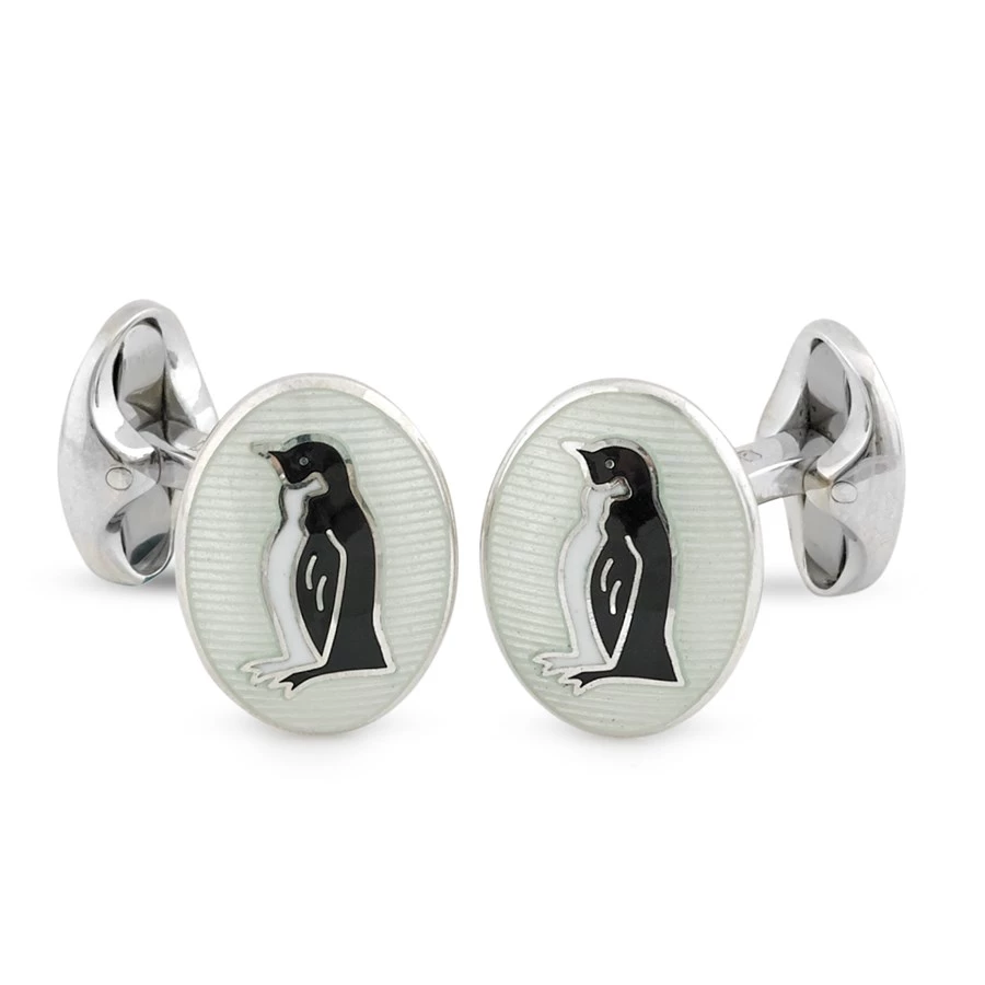 These sterling silver oval cufflinks have been hand-enameled with intricate, black and white penguins – great for all penguin fanatics! Features a small domed oval spring link fitting.