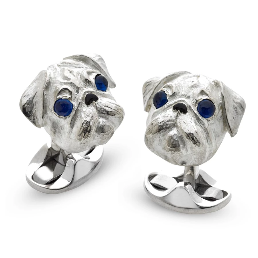 Sociable and gentle companion dogs. With their wrinkly faces and glum expressions, they have captured the hearts of the nation. Wide eyes consisting of deep blue cabochon sapphire gems. Small domed spring link fitting. Handmade in England.