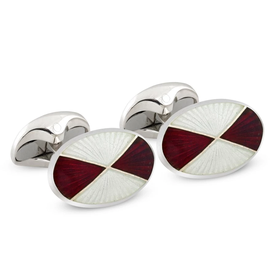 Classic cufflinks feature rich enamelled hues in quarters, set into hallmarked sterling silver. Features sugarloaf t-bar closures. Handmade in England.