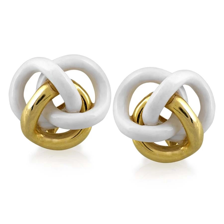 Classic love knots handmade in America of 18k yellow gold with hand-carved white agate. 1” diameter.
