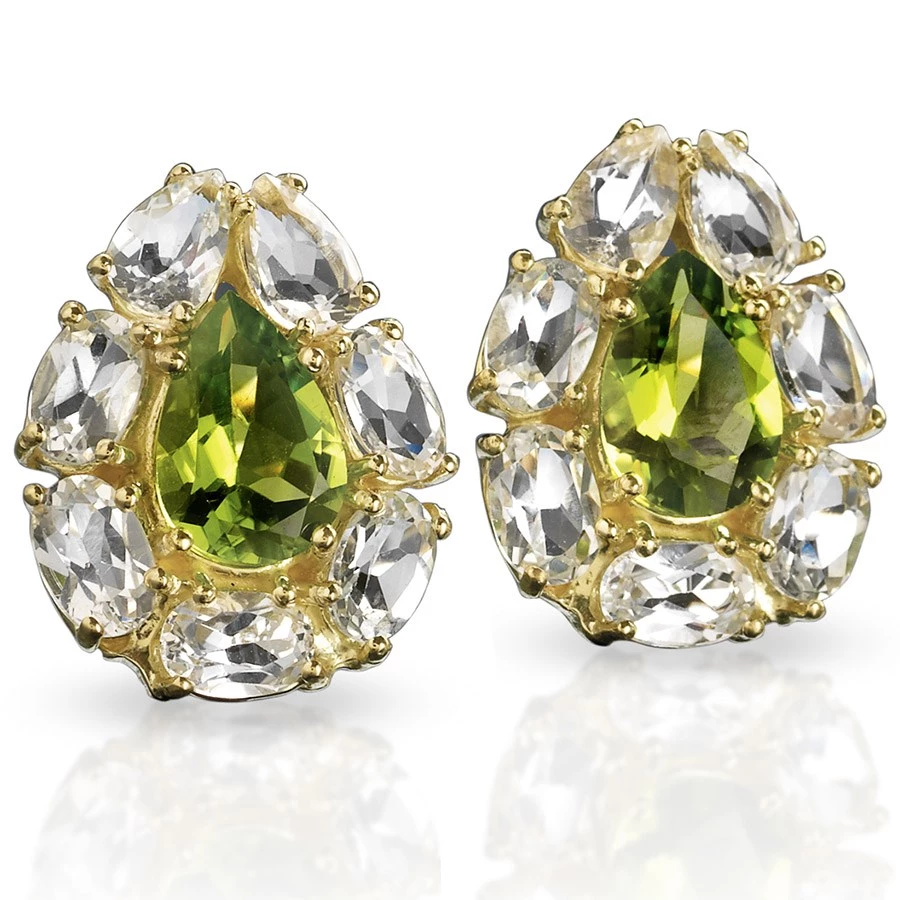 Seven oval faceted white topaz surround each stunning pear-cut peridot. Each gemstone is prong-set by hand into timeless 18k yellow gold. Handmade in America.